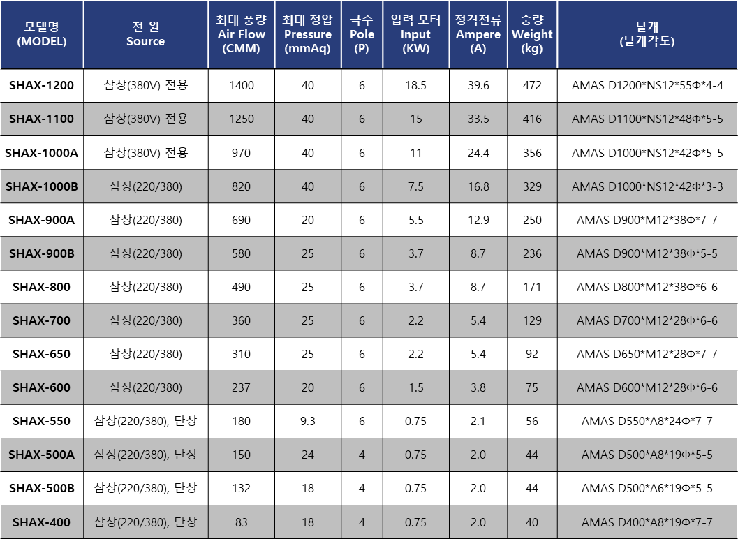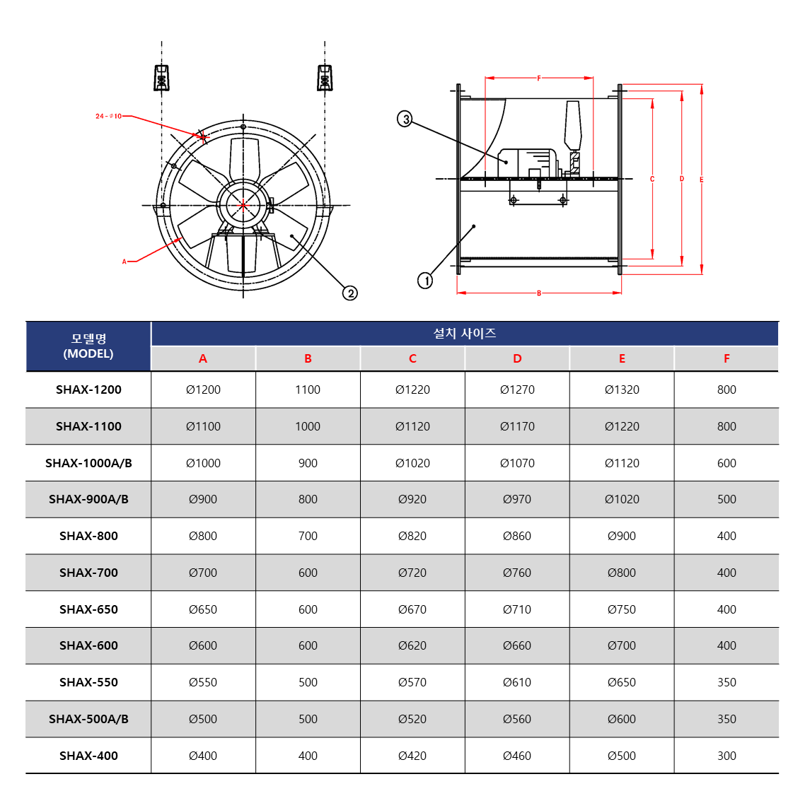 AXIAL FAN 엑셀팬 원심 송풍기보다 크기가 작으며, 장비 중량이 가벼워 좁은 장소에서도설치가 용이합니다.구조가 단순하며 기류의 방향과 동일하게 환기가 이루어집니다.고강도의 EP(Engineering Plastic) 날개를 사영하여 녹이 슬지 않고고온 다습한 화공약품에도 안전합니다. 카다로그 제작시방서 시험성과대비표 유지관리지침서 시험성적서 제원 ※ 성능 및 품질 개선을 위해 제원은 예고 없이 변경될 수 있습니다. 성능표 ※ 성능 및 품질 개선을 위해 제원은 예고 없이 변경될 수 있습니다. ※ 성능 및 품질 개선을 위해 제원은 예고 없이 변경될 수 있습니다.